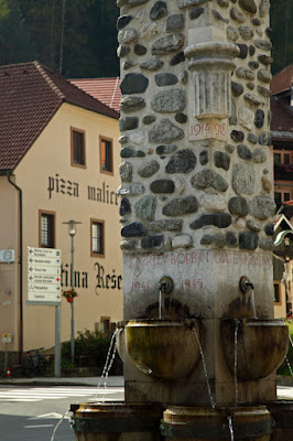 Opis: Spomenik, zasnovan kot fontana z bazenom, koriti in slopom z doprsjem na vrhu, z izvirnimi detajli in kombiniranimi materiali.